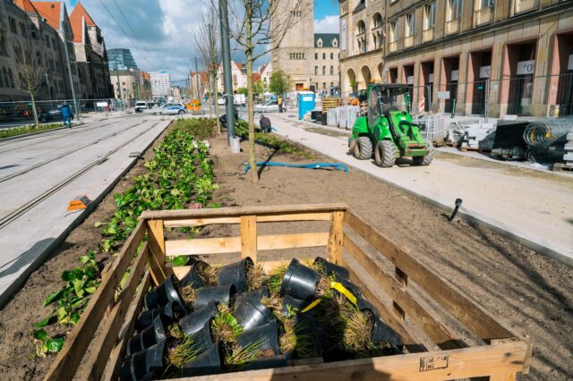Nowa zieleń jest bardzo ważnym elementem Programu Centrum. Na ul. Święty Marcin między ul. Gwarną a al. Niepodległości posadzono już 18 platanów i 12 wiązów, które tworzą dwa szpalery drzew wzdłuż torowiska tramwajowego. Na odcinku od ul. Kościuszki do Gwarnej posadzona jest już część zieleni niskiej w pasie między torowiskiem a jezdnią. Docelowo wzdłuż chodnika przed Aulą Uniwersytecką i Collegium Iuridicum – po północnej stronie ul. Św. Marcin – będą rosły również platany oddzielające chodnik i drogę rowerową od jezdni. Na odcinku od al. Niepodległości do mostu Uniwersyteckiego pojawi się w sumie jeszcze 19 drzew (oprócz platanów także grusze i lipa). Cały zakres tego etapu Programu Centrum – od ul. Gwarnej do mostu Uniwersyteckiego wraz ze skrzyżowaniami – wzbogaci się o 49 drzew oraz liczne nasadzenia zieleni niskiej: krzewów i bylin.